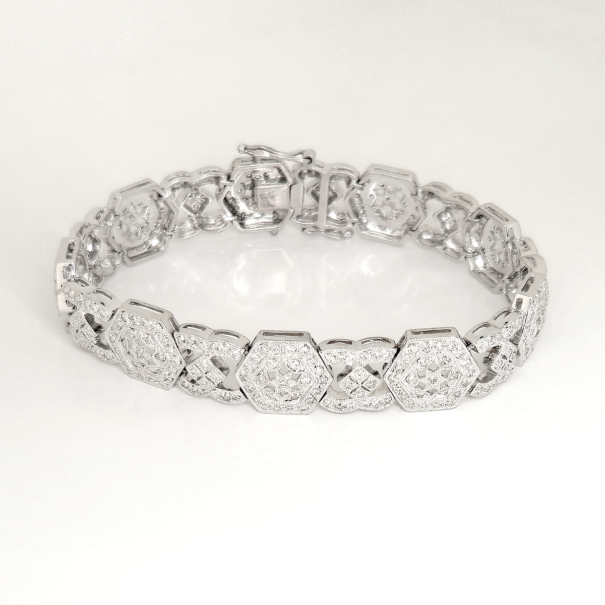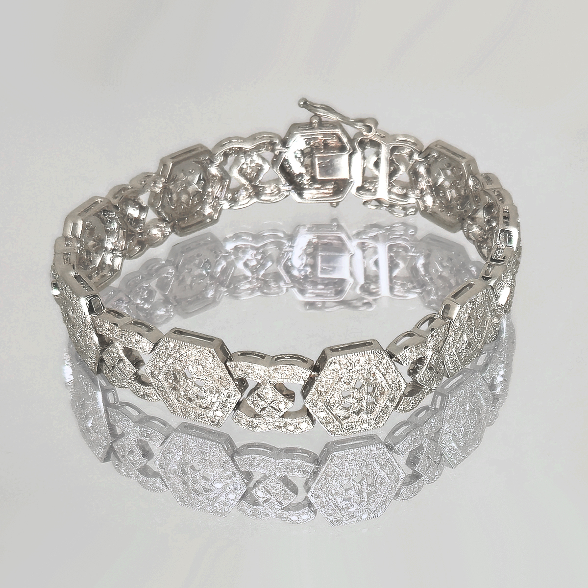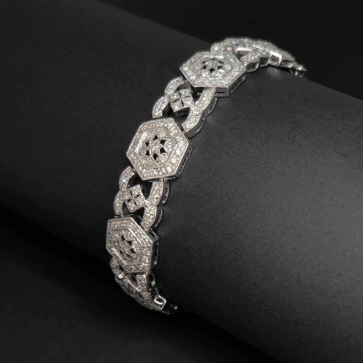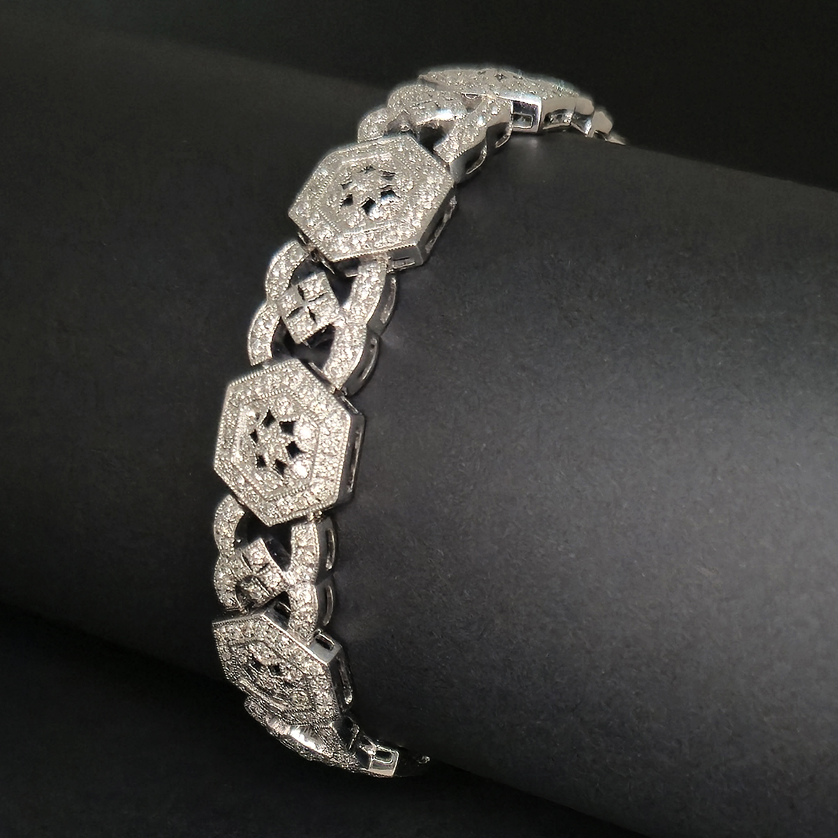 A lavish bracelet fashioned with dozens of light catching diamonds that set this to sparkling from the slightest movement