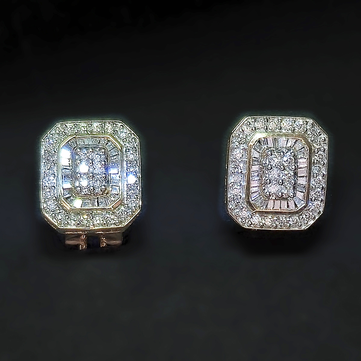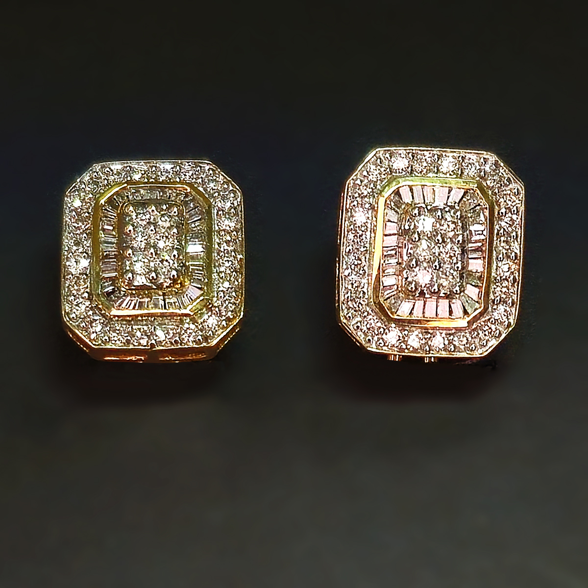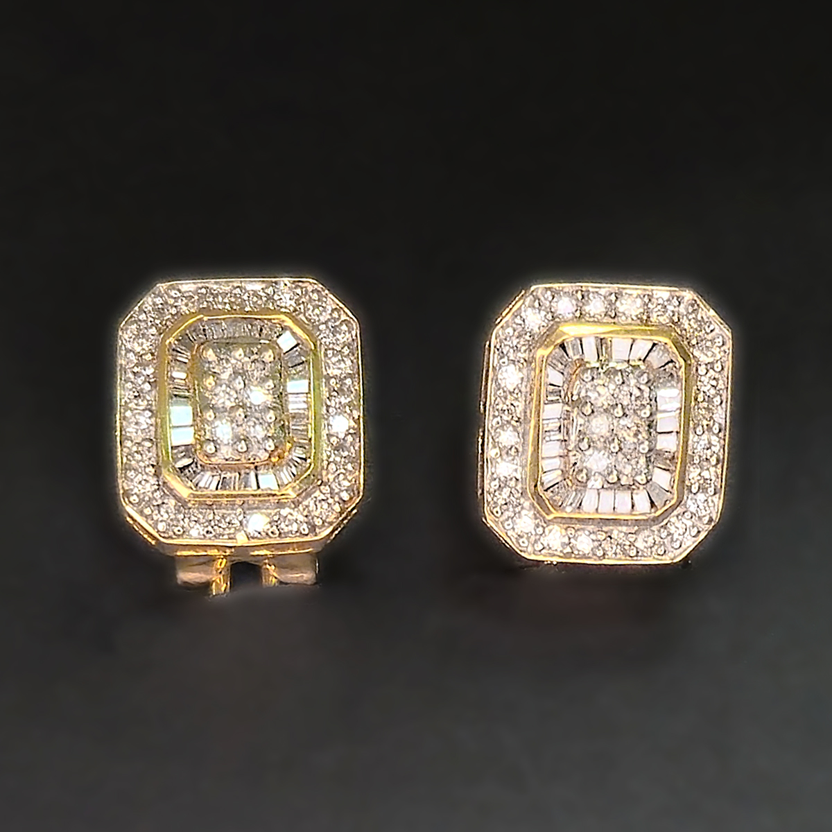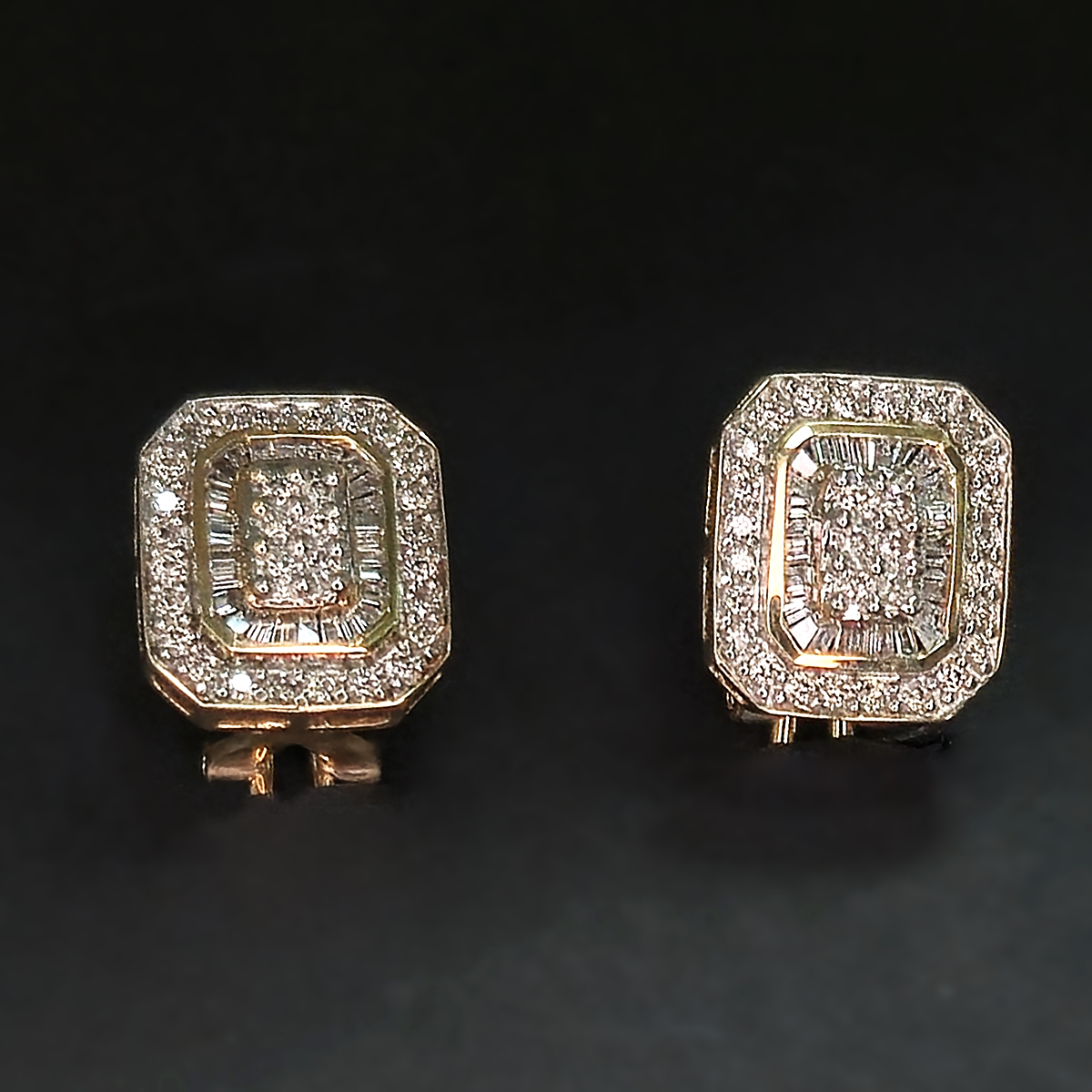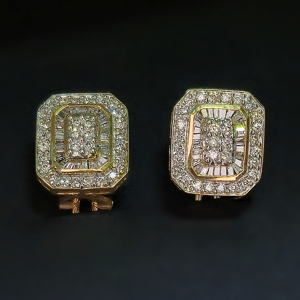 Warm yellow gold earrings with dozens of diamonds designed to catch the light.
